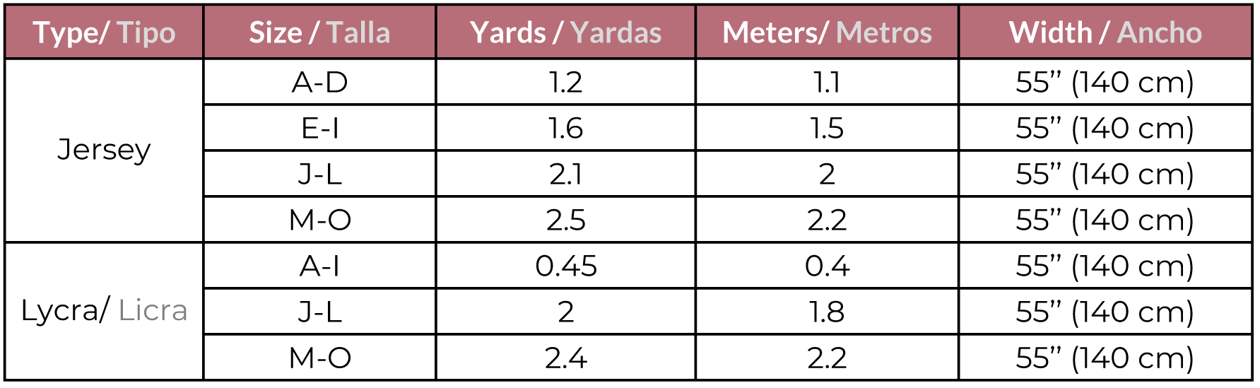 Pattern includes detailed yardage charts for all sizes to help you purchase the perfect amount of fabric.